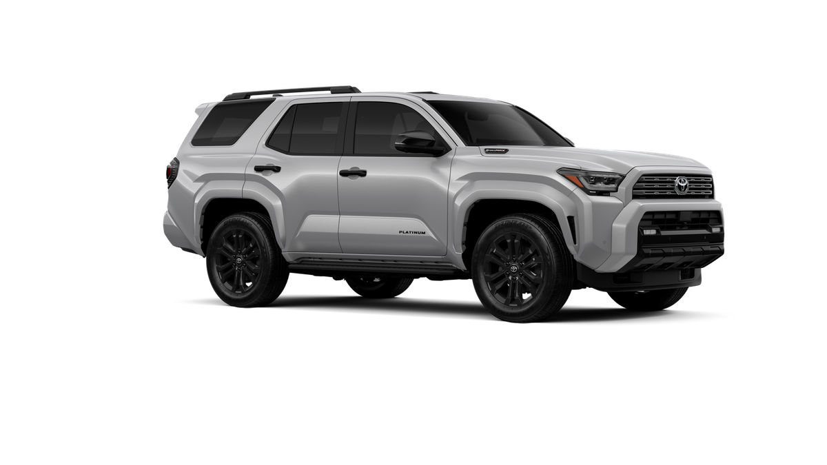 - Dark-chrome tri-bar grille; gloss-black mirror caps and door handles; color-keyed overfenders and rear spoiler; gloss-black "PLATINUM" and "4RUNNER" badges