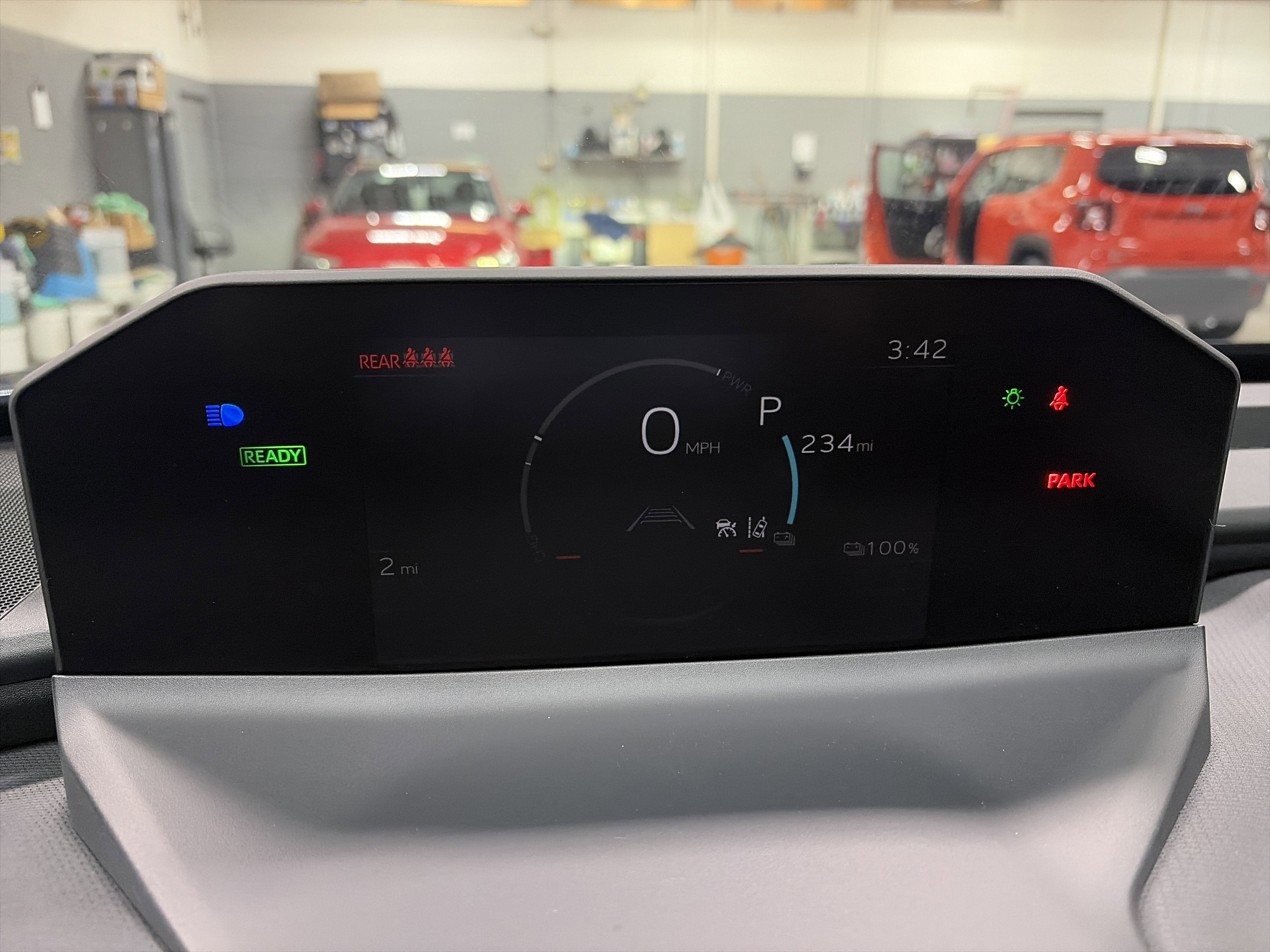 - Top-mount Multi-Information Display (MID) with indicators and 7-in. LCD display with speedometer, charge meter, power output meter, drive mode indicators, instrumentation and customizable settings, odometer, tripmeters, clock, outside temperature, rear passenger seatbelt indicators, fuel economy information, trip timer, charging information and settings, and warning messages